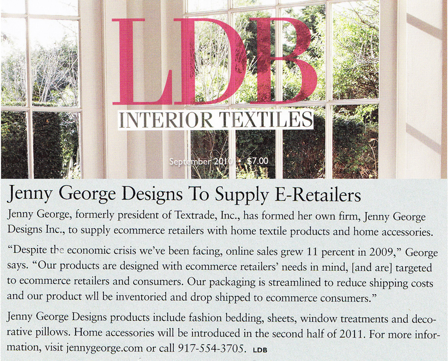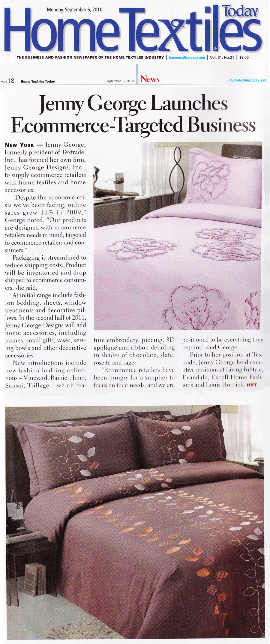 Article  Source: Web | Date: Aug 25, 2010  New York - Jenny George, formerly president of Textrade, Inc., has formed her own firm, Jenny George Designs, Inc., to supply ecommerce ...
